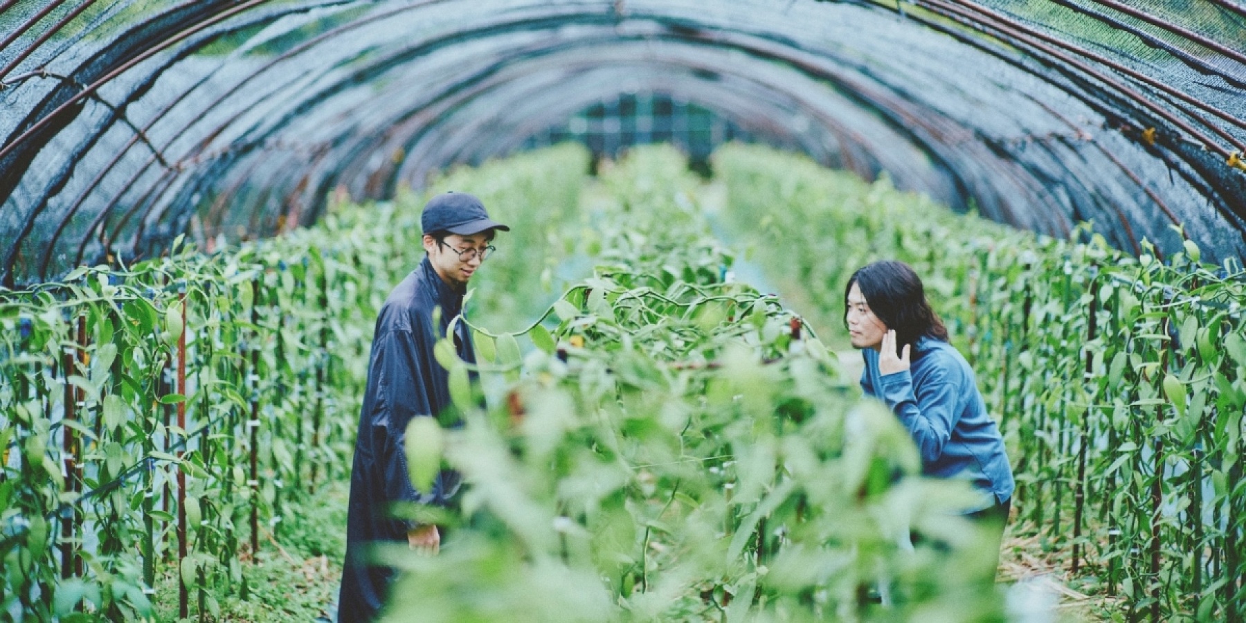 Left: Mr. Nishimura smelling the scent of cassia. Right: Vanilla cultivation has begun on the island. It is scheduled to be used in "Botanical" going forward.