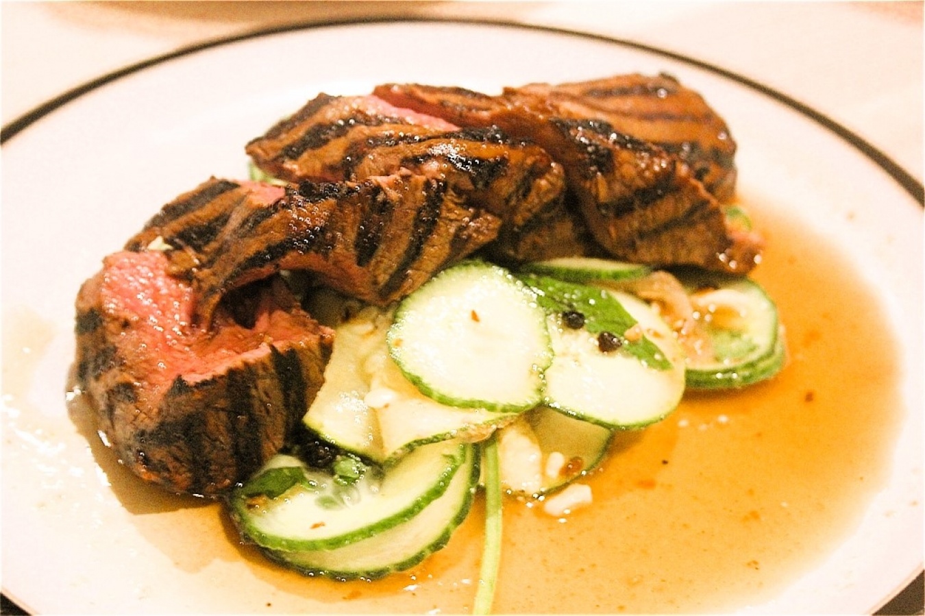 メインディッシュの一皿「グリルドビーフ、出汁ヴィネガーソースで」。